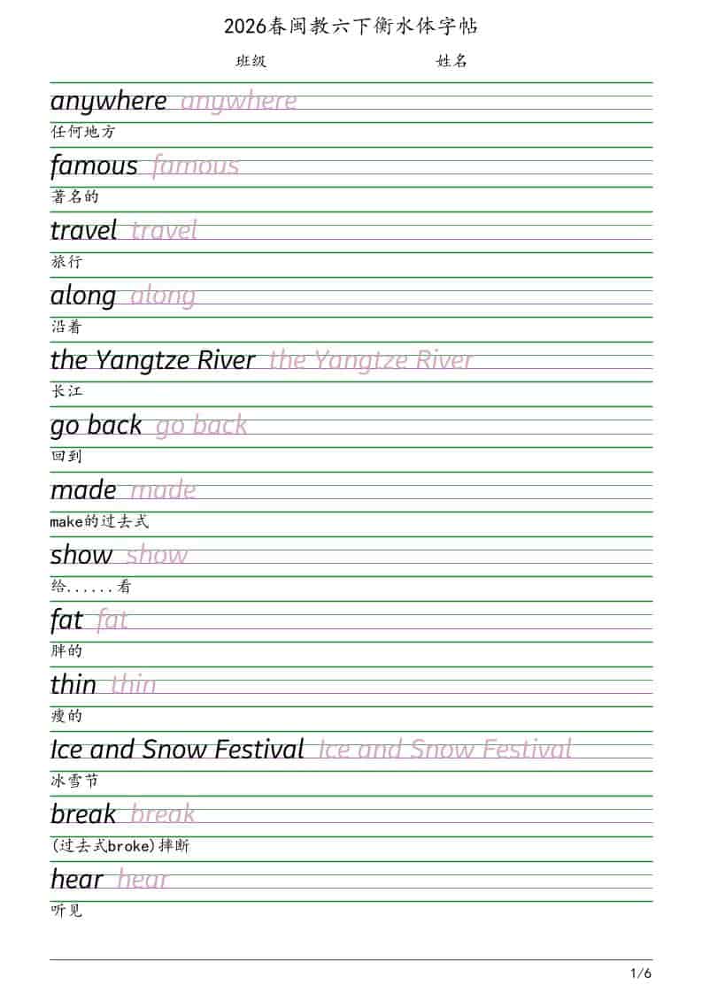 六年级下英语衡水体字帖《闽教版》