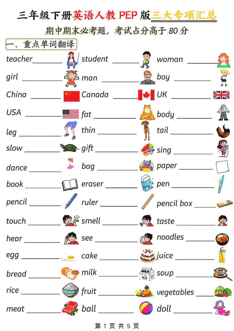 三年级下英语单词晨读晚默小纸条《人教PEP》