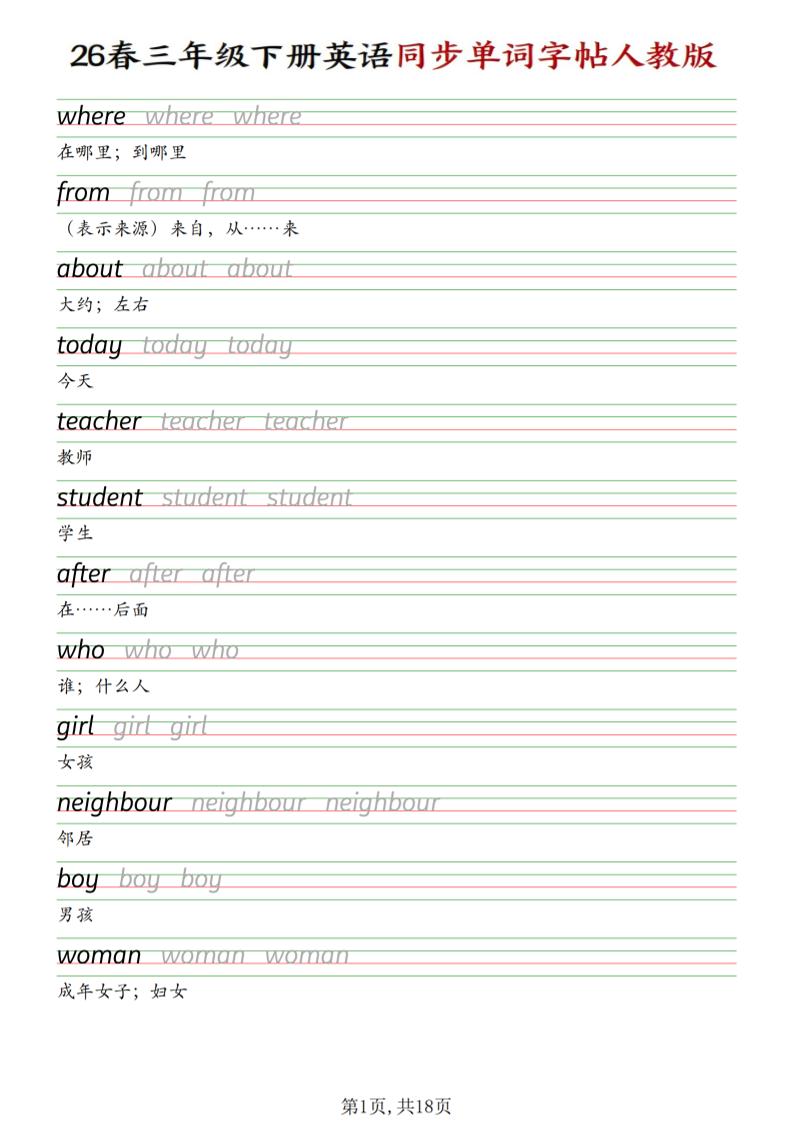 三下人教PEP版英语同步单词字帖