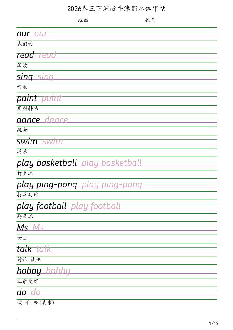 三年级下英语衡水体字帖《沪教版》